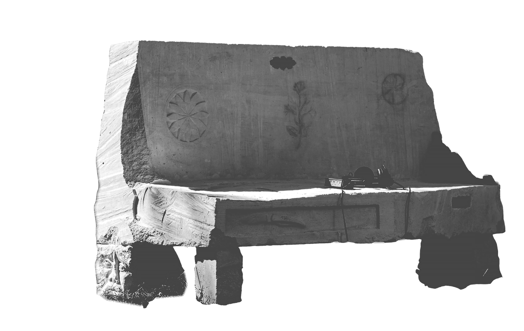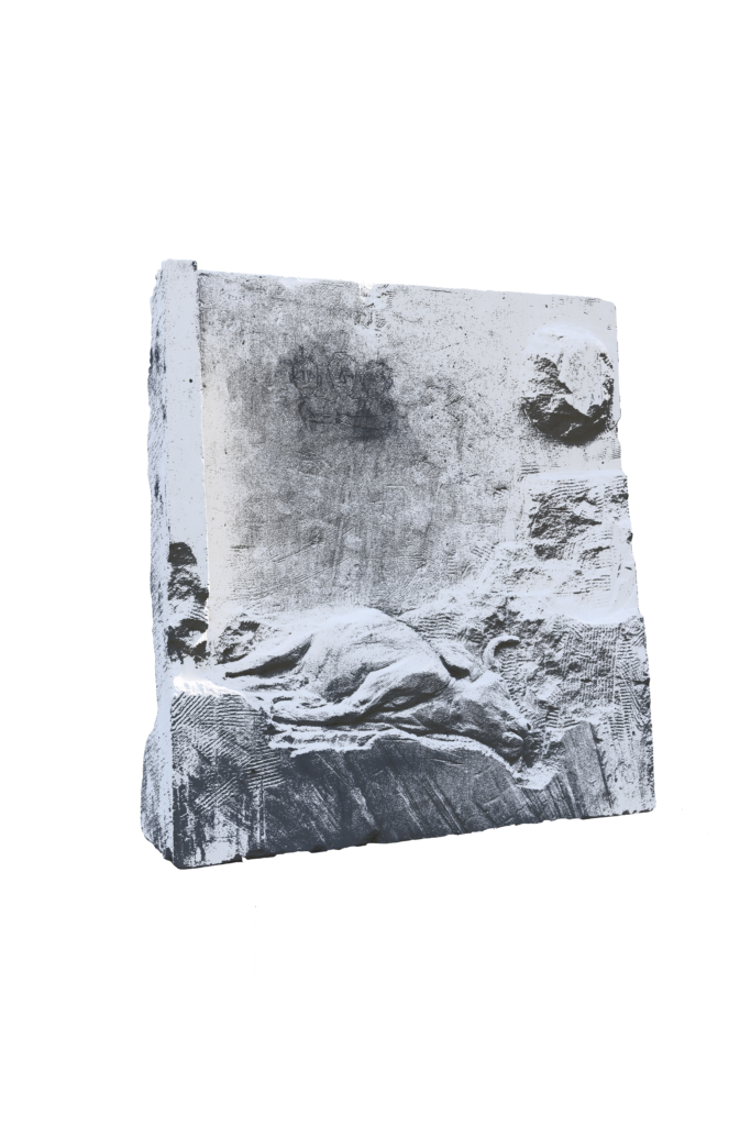 Sorte de storyboard qui tient en une dizaine d’images, agencées en six volumes de pierre provenant chacun d’un seul et même bloc calcaire, les projections mentales du livre et futur film se déploient par scène sur plusieurs bas-reliefs.