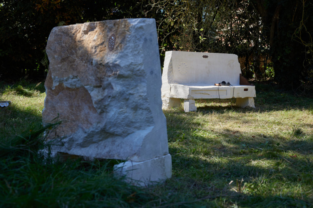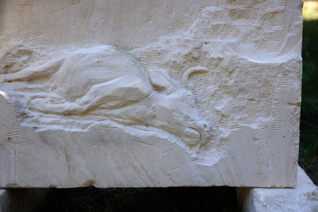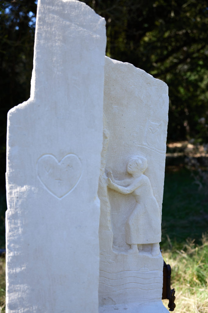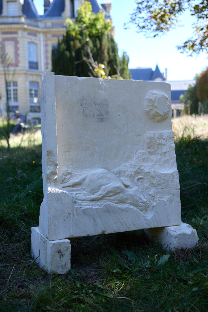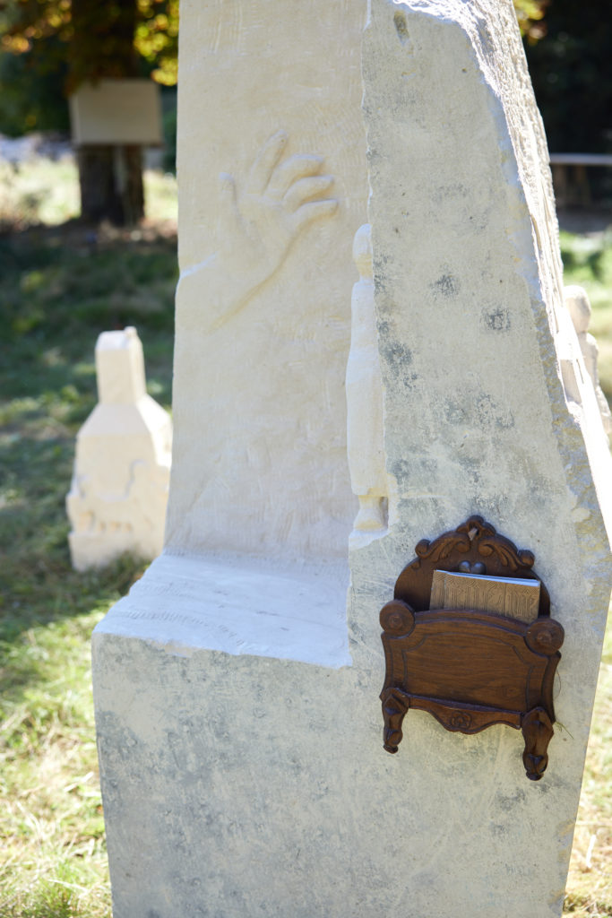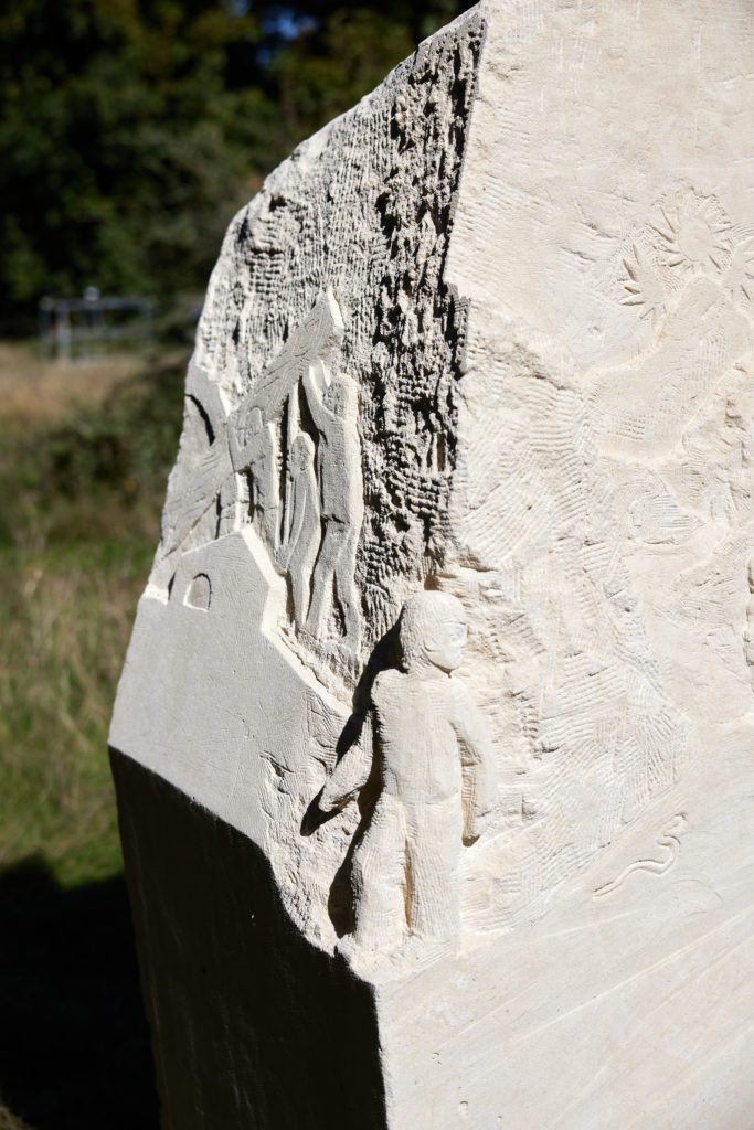 Sorte de storyboard qui tient en une dizaine d’images, agencées en six volumes de pierre provenant chacun d’un seul et même bloc calcaire, les projections mentales du livre et futur film se déploient par scène sur plusieurs bas-reliefs.
